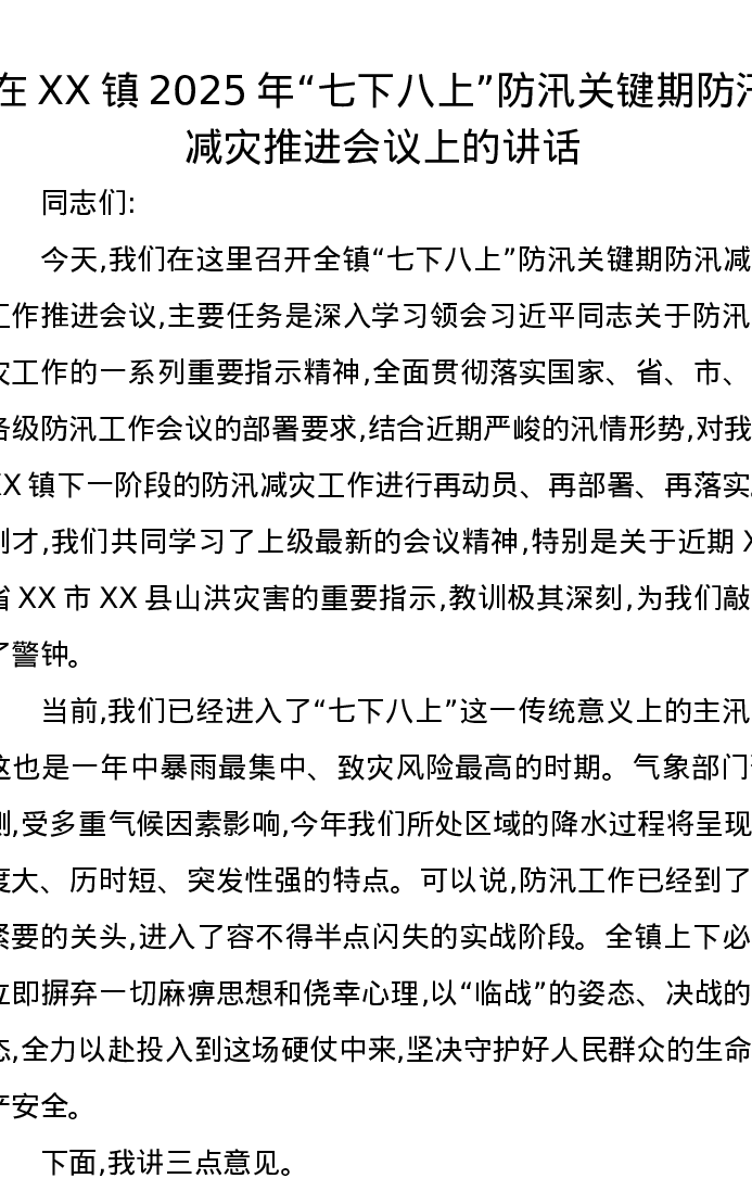 在XX镇2025年“七下八上”防汛关键期防汛减灾推进会议上的讲话