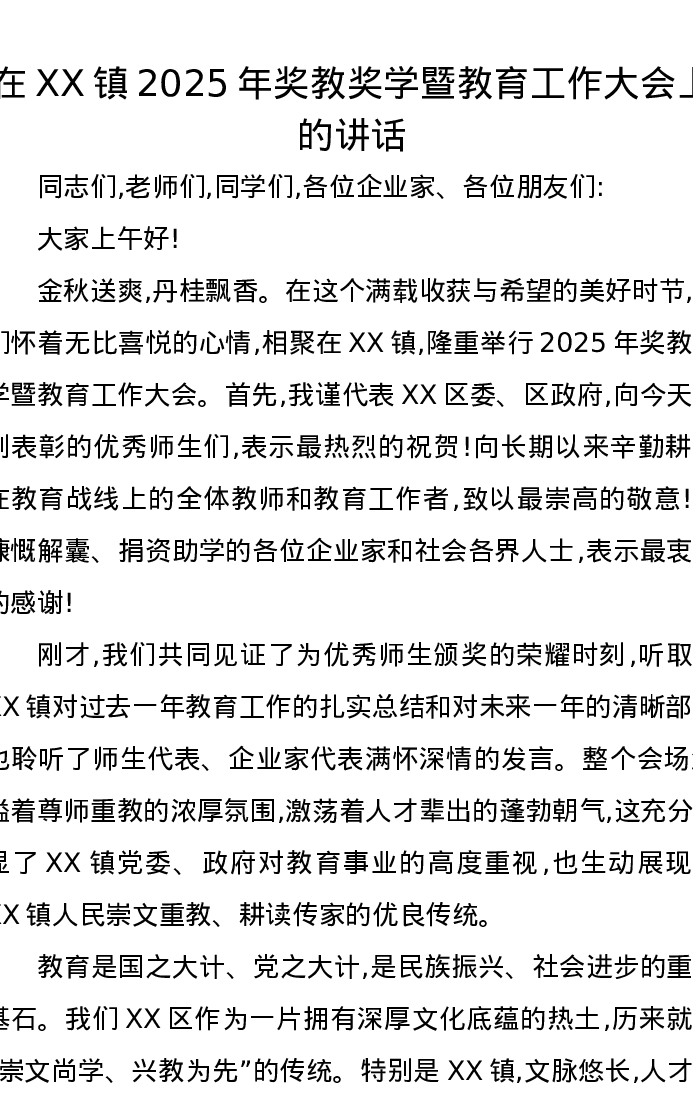 在XX镇2025年奖教奖学暨教育工作大会上的讲话