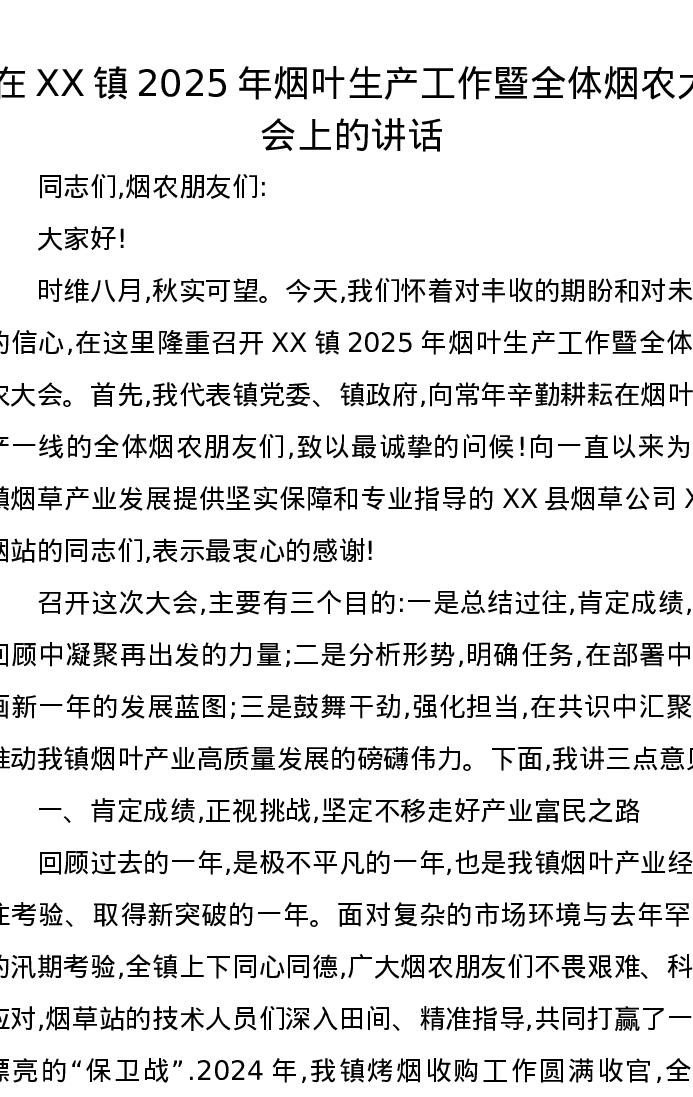 在XX镇2025年烟叶生产工作暨全体烟农大会上的讲话
