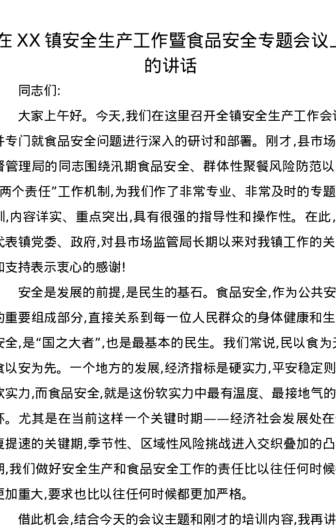 在XX镇安全生产工作暨食品安全专题会议上的讲话