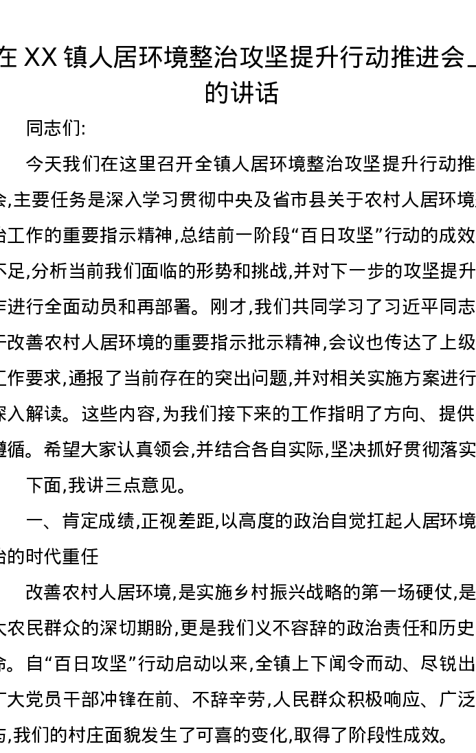 在XX镇人居环境整治攻坚提升行动推进会上的讲话