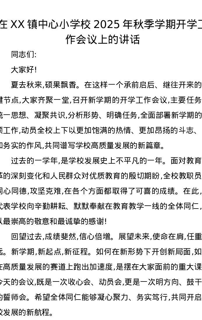 在XX镇中心小学校2025年秋季学期开学工作会议上的讲话