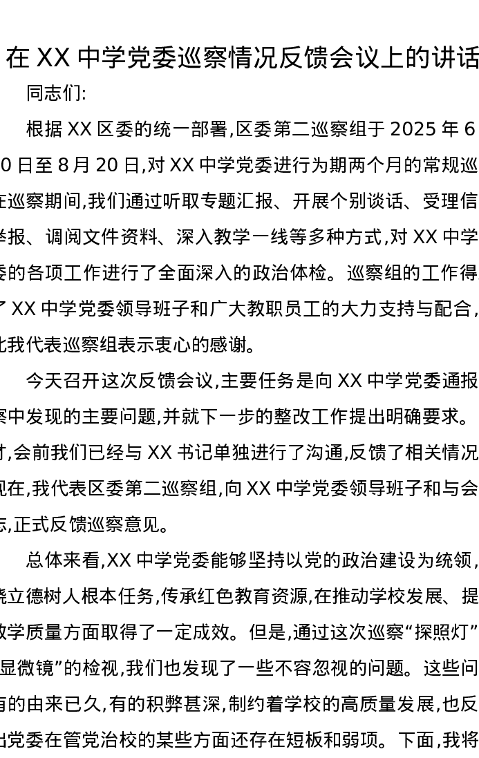 在XX中学党委巡察情况反馈会议上的讲话