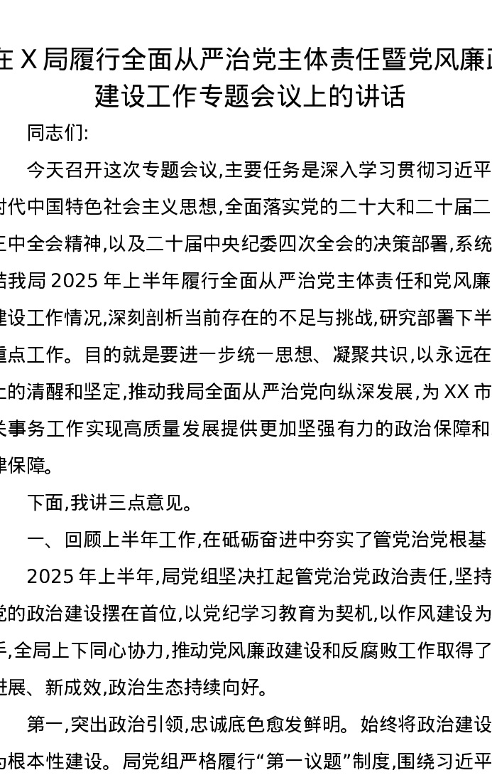 在X局履行全面从严治党主体责任暨党风廉政建设工作专题会议上的讲话