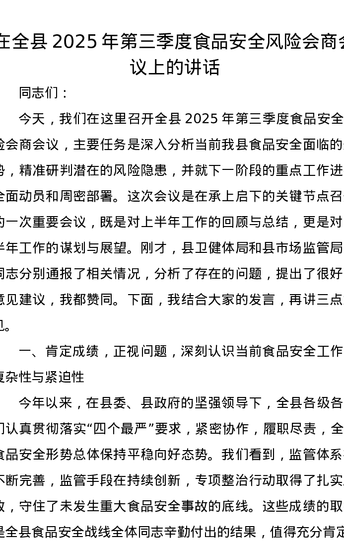 在全县2025年第三季度食品安全风险会商会议上的讲话