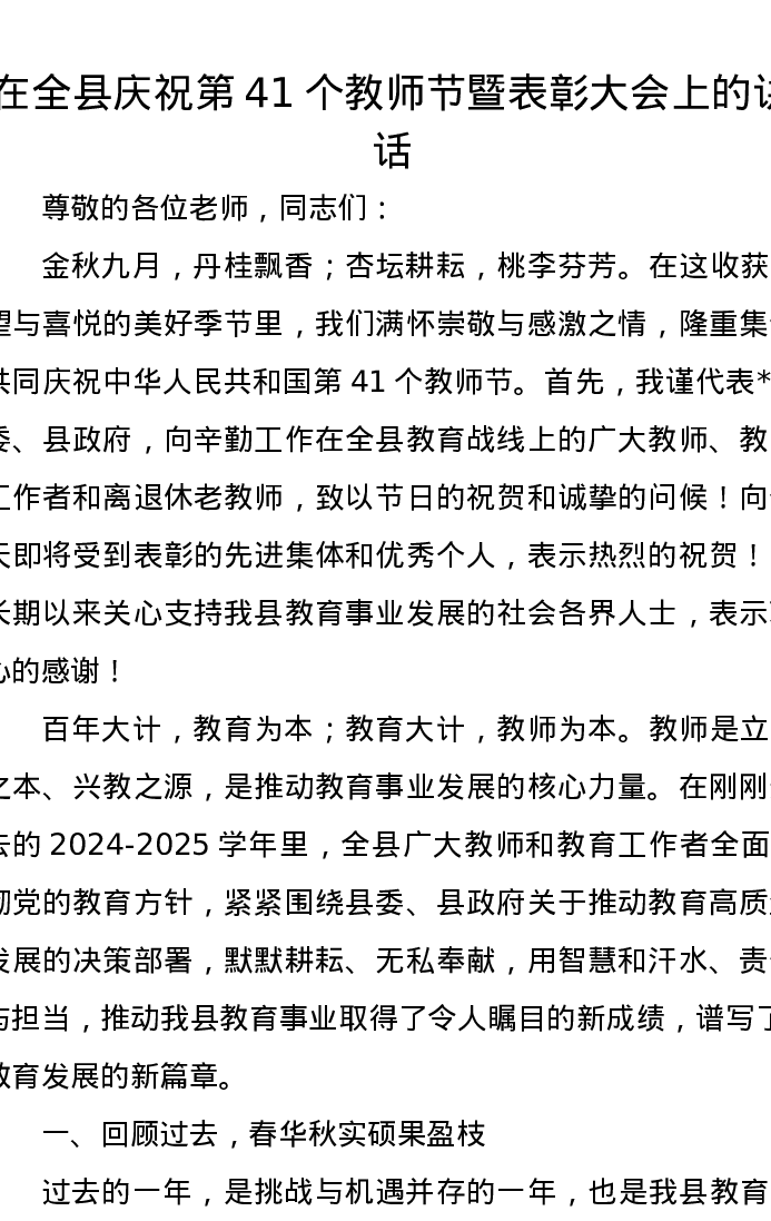 在全县庆祝第41个教师节暨表彰大会上的讲话