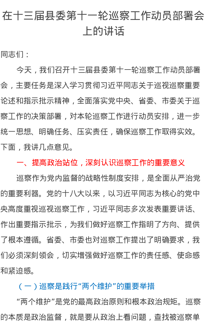 在十三届县委第十一轮巡察工作动员部署会上的讲话