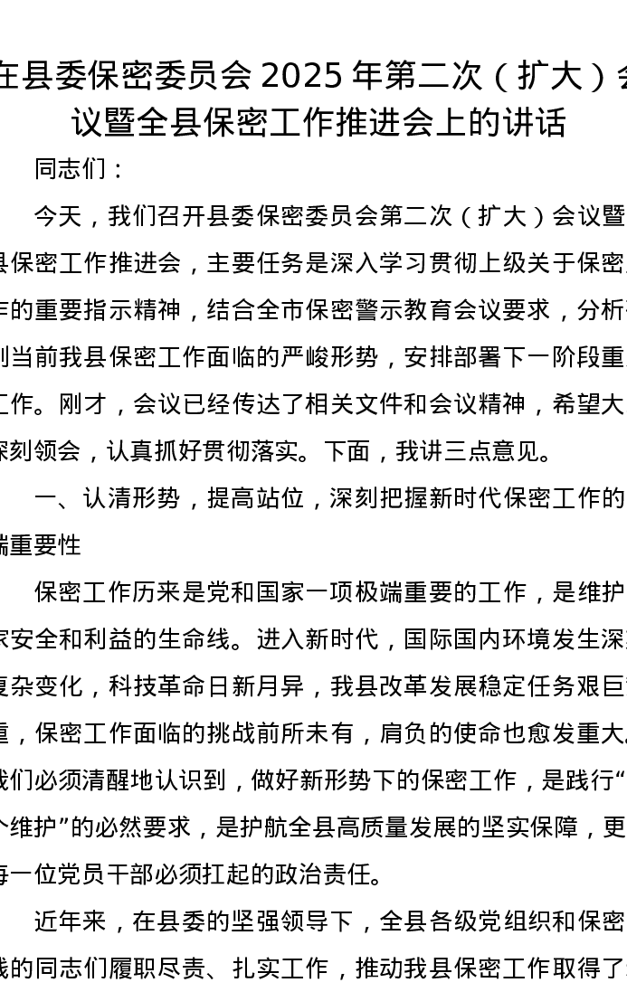 在县委保密委员会2025年第二次(扩大)会议暨全县保密工作推进会上的讲话