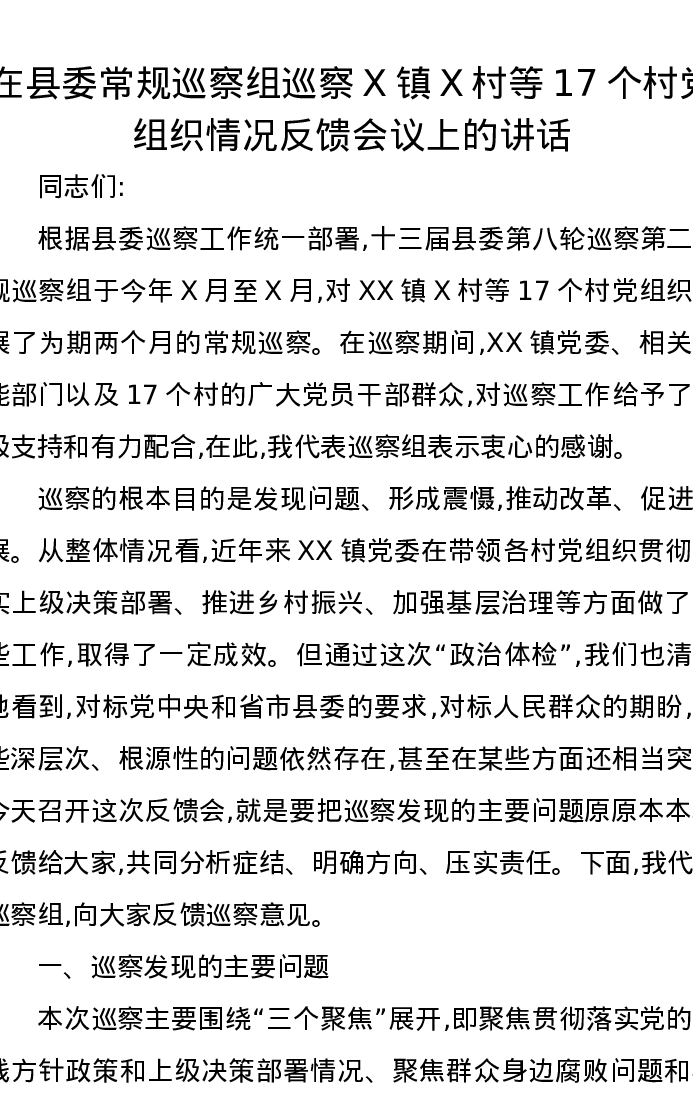 在县委常规巡察组巡察X镇X村等17个村党组织情况反馈会议上的讲话