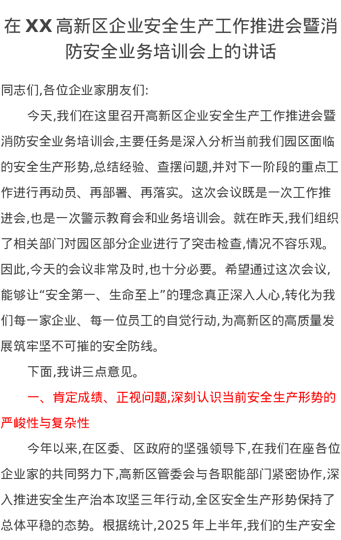 在XX高新区企业安全生产工作推进会暨消防安全业务培训会上的讲话