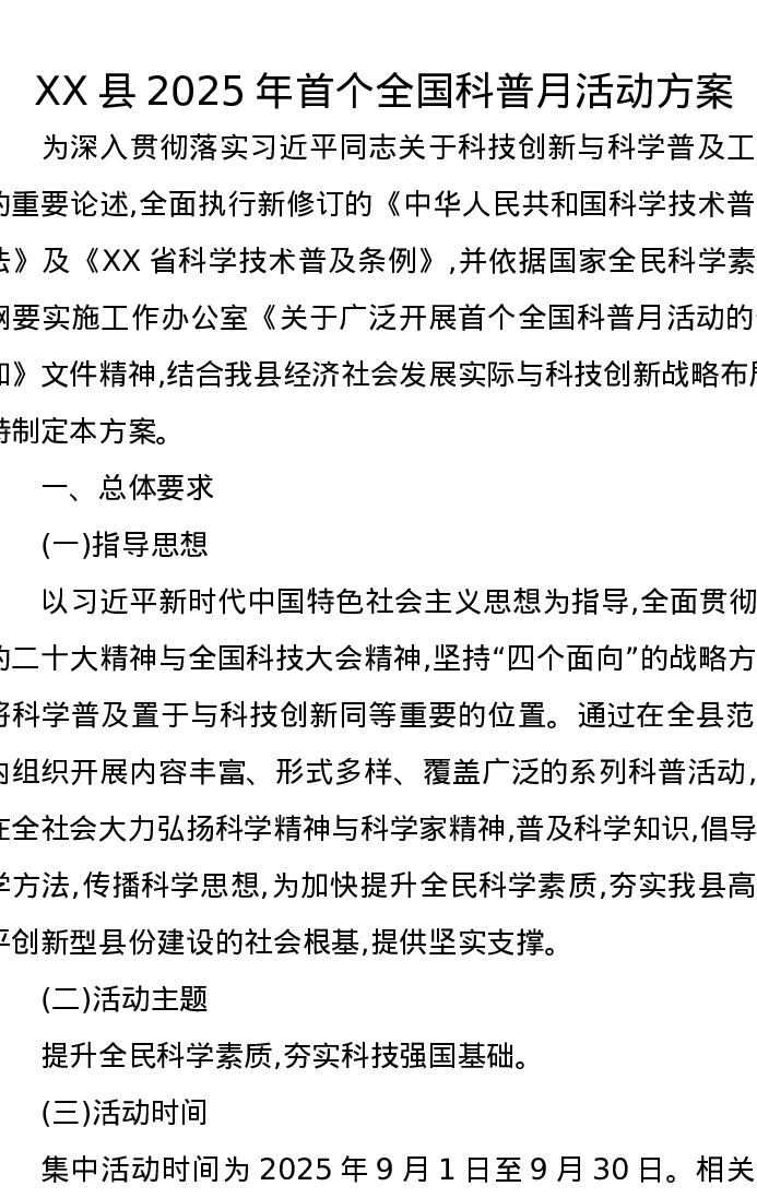 XX县2025年首个全国科普月活动方案