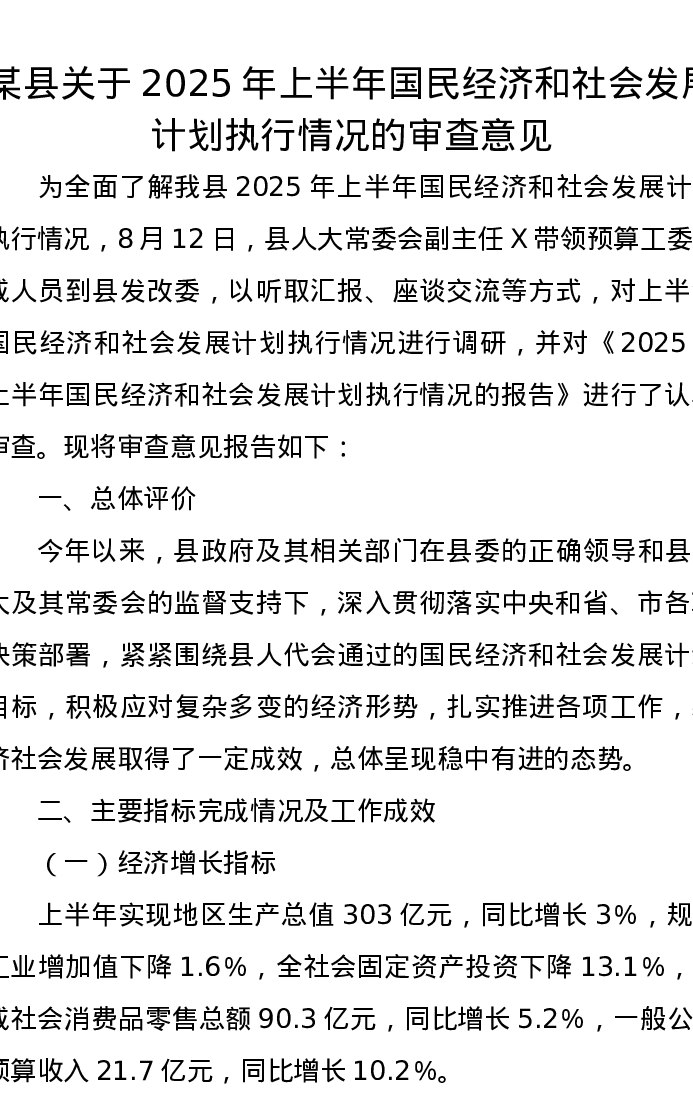 某县关于2025年上半年国民经济和社会发展计划执行情况的审查意见