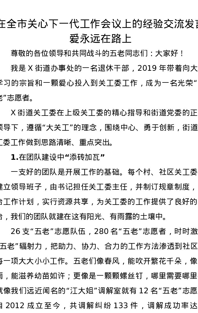 在全市关心下一代工作会议上的经验交流发言:爱永远在路上