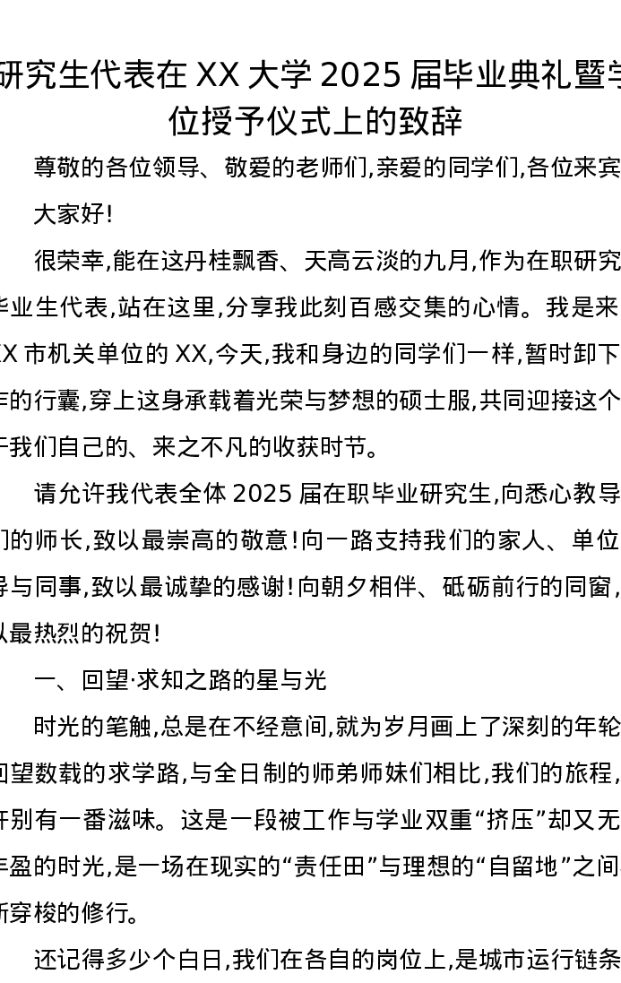 研究生代表在XX大学2025届毕业典礼暨学位授予仪式上的致辞