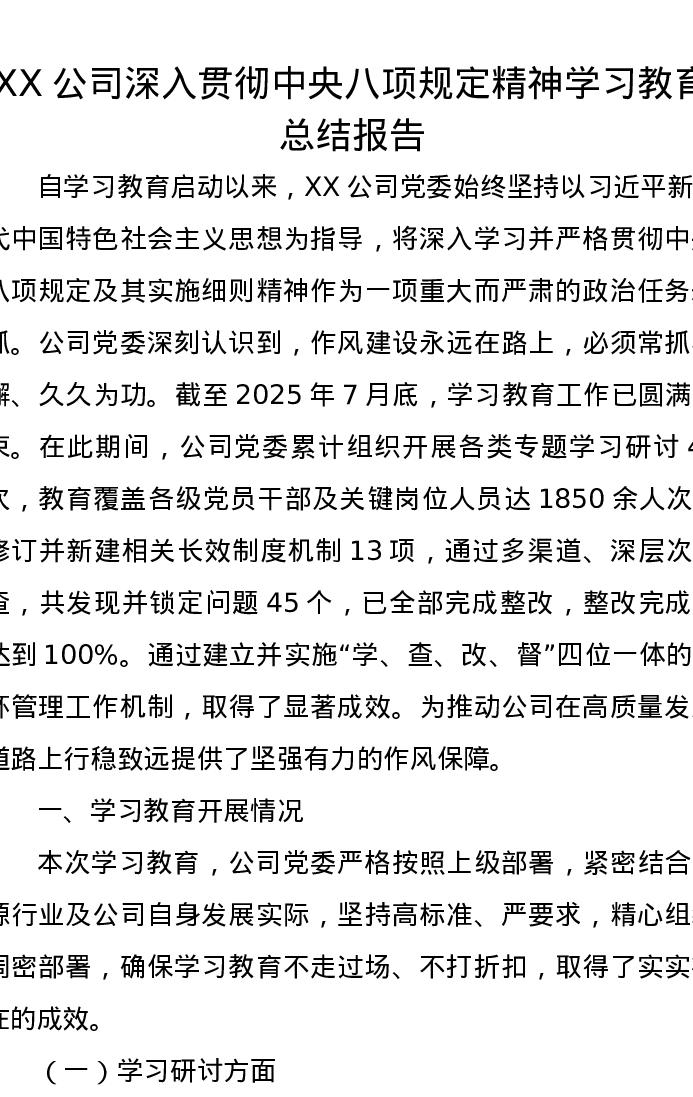 XX公司深入贯彻中央八项规定精神学习教育总结报告