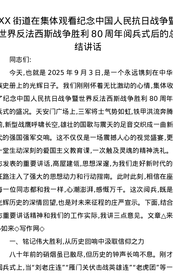 XX街道在集体观看纪念中国人民抗日战争暨世界反法西斯战争胜利80周年阅兵式后的总结讲话