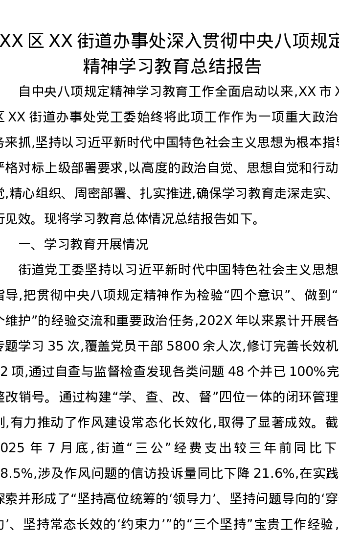 XX区XX街道办事处深入贯彻中央八项规定精神学习教育总结报告