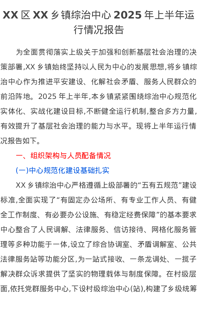 XX区XX乡镇综治中心2025年上半年运行情况报告