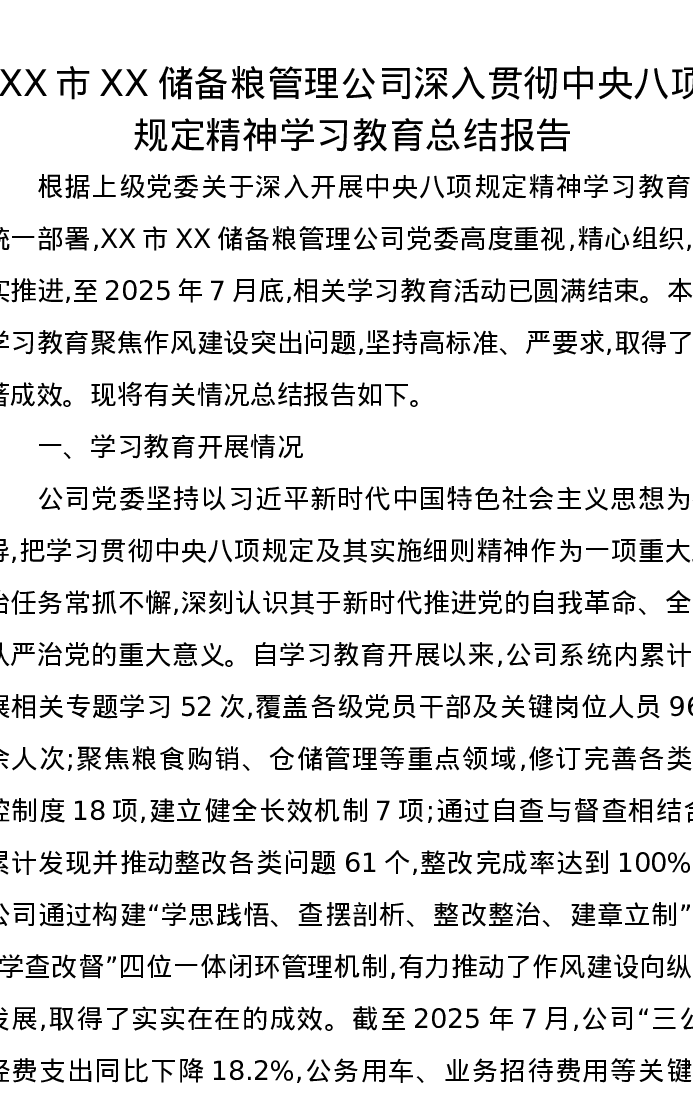 XX市XX储备粮管理公司深入贯彻中央八项规定精神学习教育总结报告