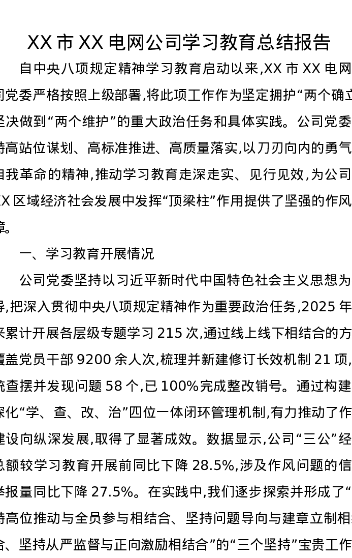 XX市XX电网公司贯彻中央八项规定精神学习教育总结报告