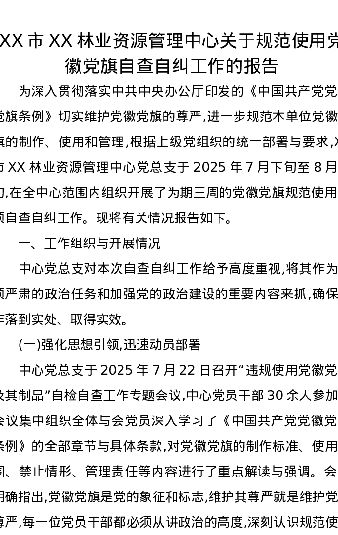 XX市XX林业资源管理中心关于规范使用党徽党旗自查自纠工作的报告