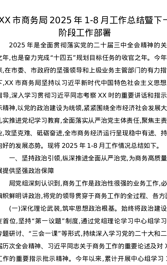 XX市商务局2025年1-8月工作总结暨下一阶段工作部署