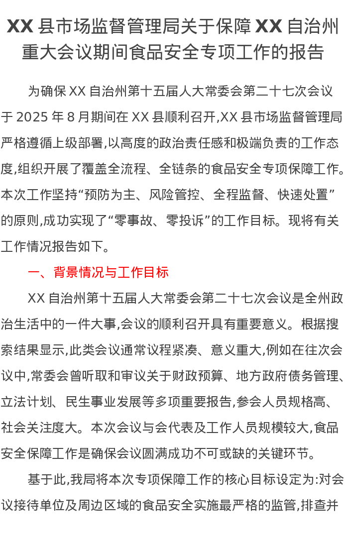 XX县市场监督管理局关于保障XX自治州重大会议期间食品安全专项工作的报告