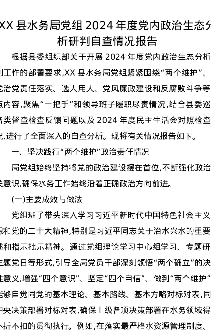 XX县水务局党组2024年度党内政治生态分析研判自查情况报告