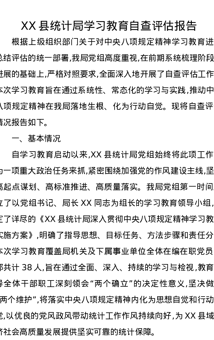 XX县统计局贯彻中央八项规定精神学习教育自查评估报告