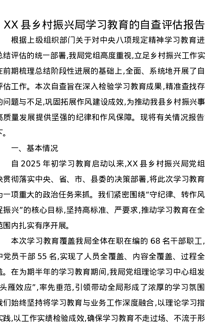 XX县乡村振兴局中央八项规定精神学习教育的自查评估报告