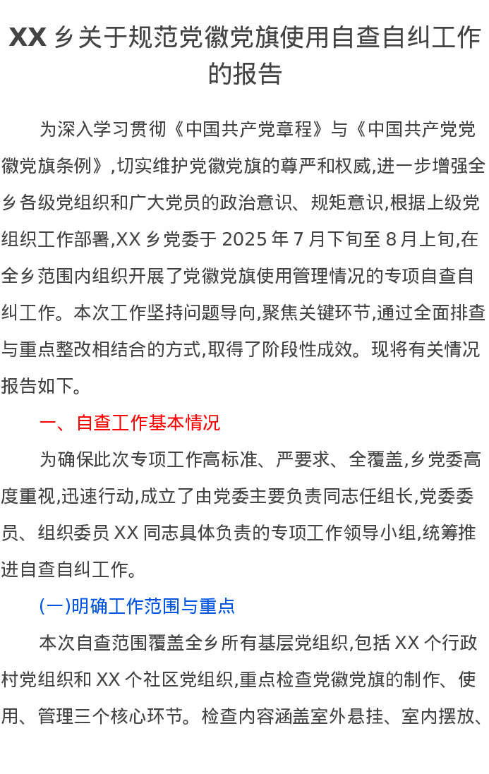 XX乡关于规范党徽党旗使用自查自纠工作的报告