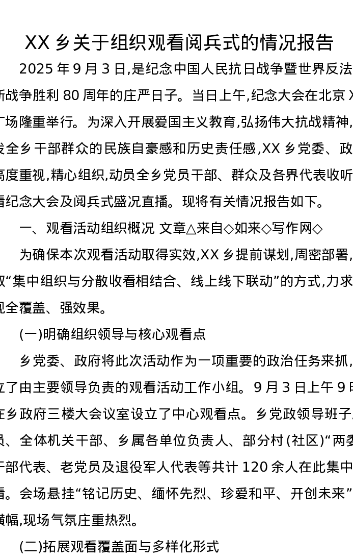 XX乡关于组织观看阅兵式的情况报告