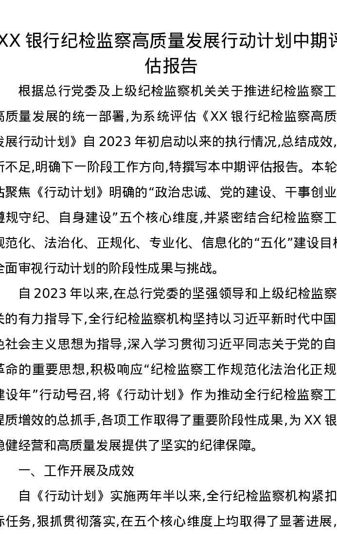 XX银行纪检监察高质量发展行动计划中期评估报告
