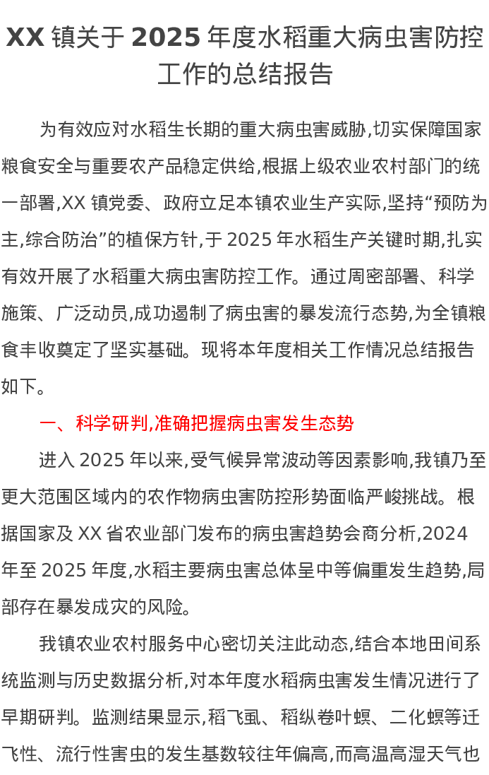 XX镇关于2025年度水稻重大病虫害防控工作的总结报告