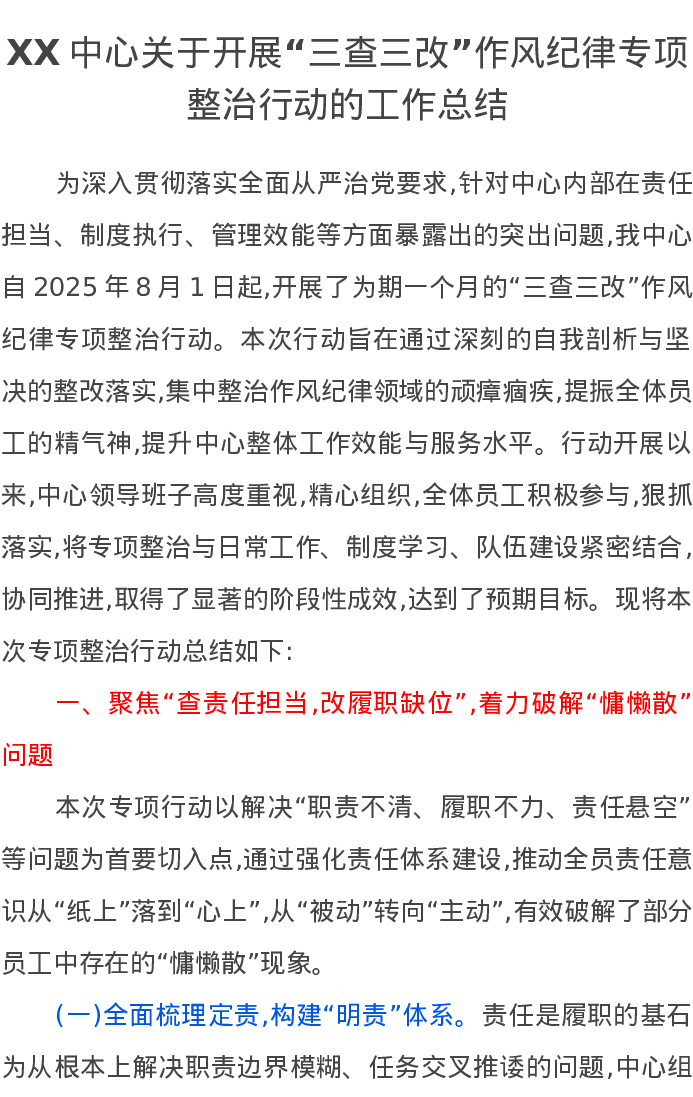 XX中心关于开展“三查三改”作风纪律专项整治行动的工作总结