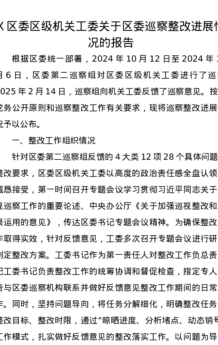 X区委区级机关工委关于区委巡察整改进展情况的报告