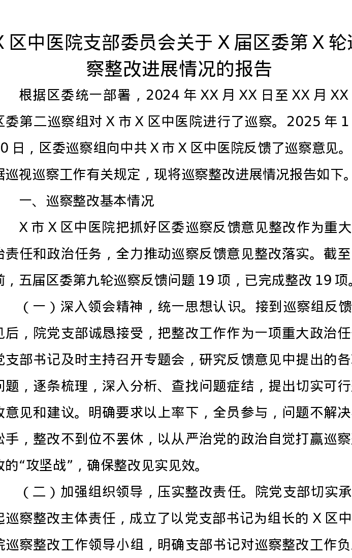 X区中医院支部委员会关于X届区委第X轮巡察整改进展情况的报告
