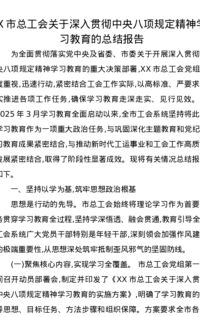 X市总工会关于深入贯彻中央八项规定精神学习教育的总结报告