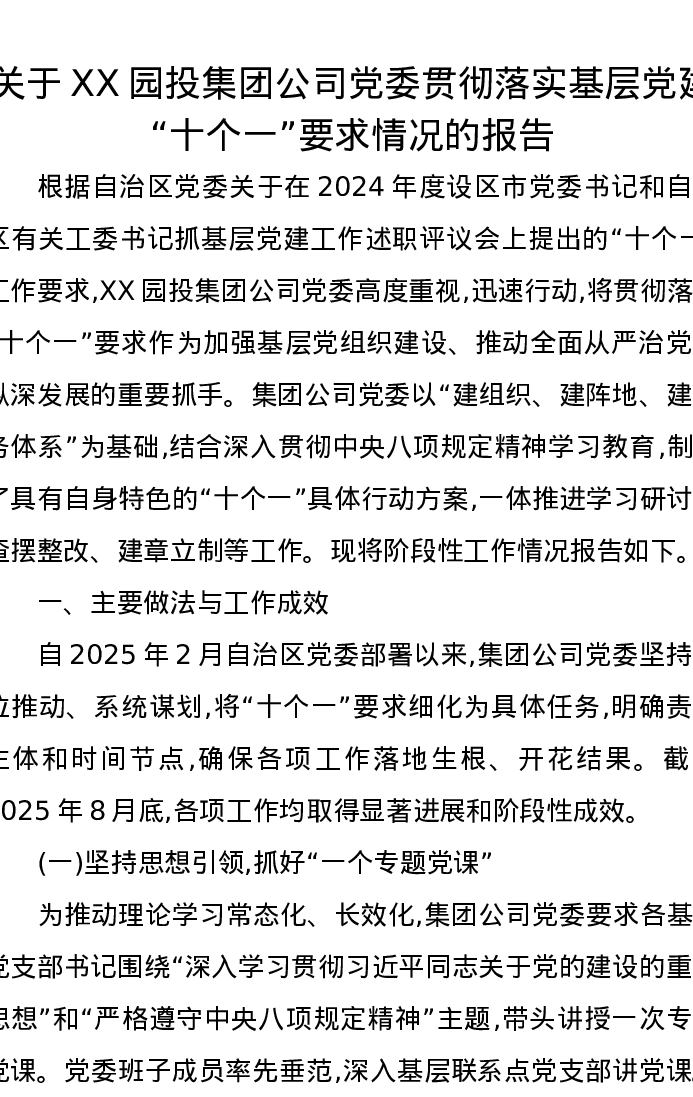 关于XX园投集团公司党委贯彻落实基层党建“十个一”要求情况的报告