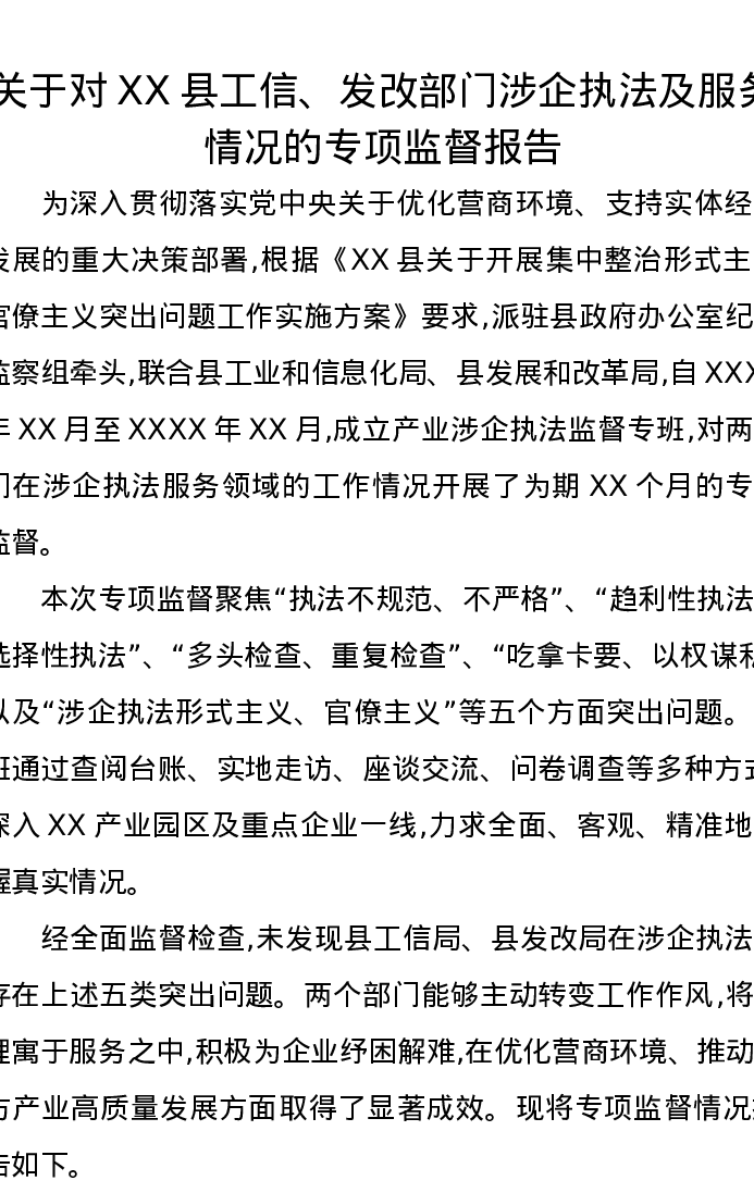 关于对XX县工信、发改部门涉企执法及服务情况的专项监督报告