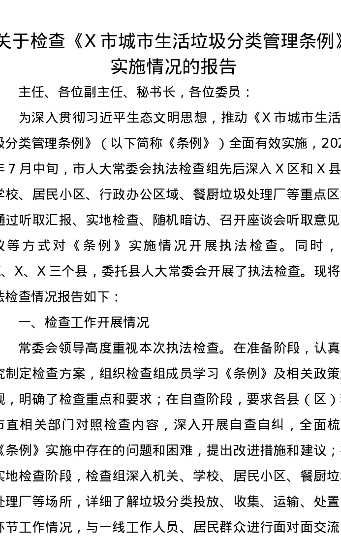 关于检查《X市城市生活垃圾分类管理条例》实施情况的报告
