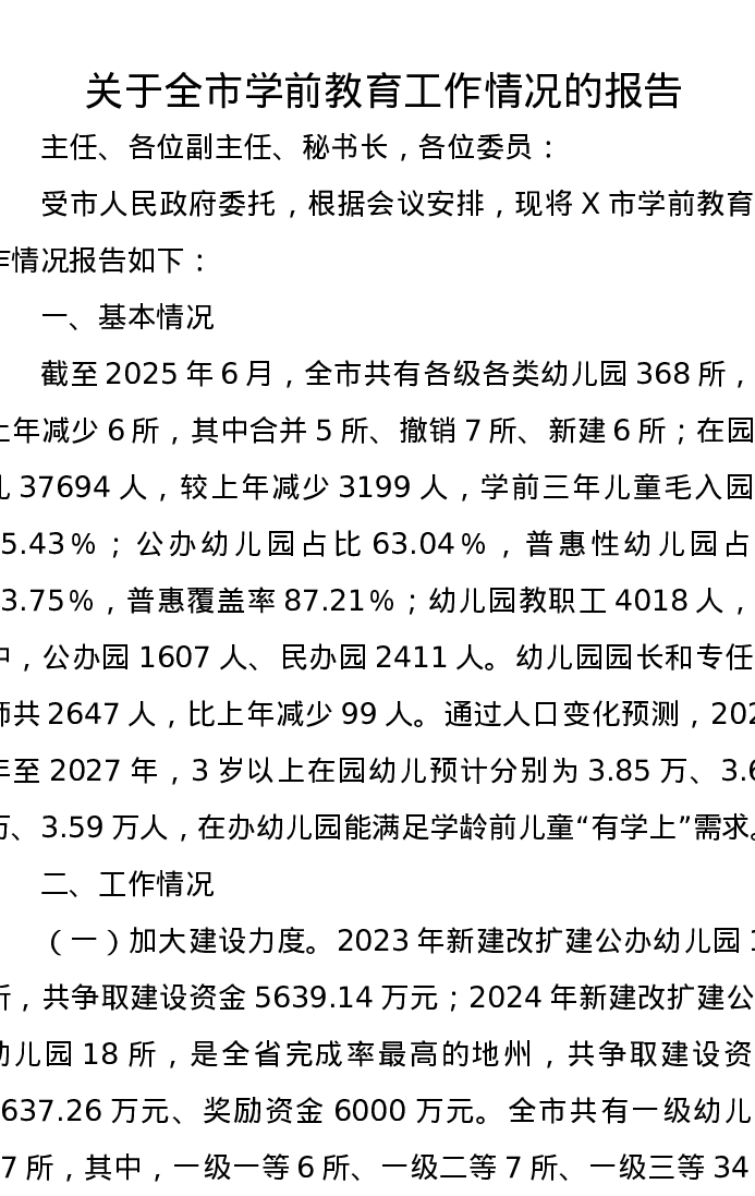 关于全市学前教育工作情况的报告