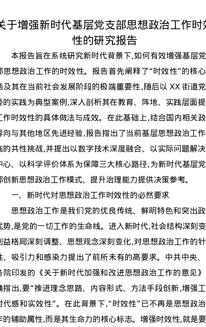 关于增强新时代基层党支部思想政治工作时效性的研究报告