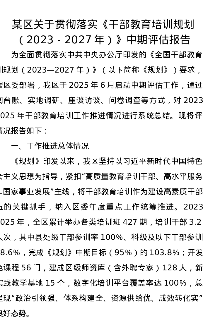 某区关于贯彻落实《干部教育培训规划(2023-2027年)》中期评估报告