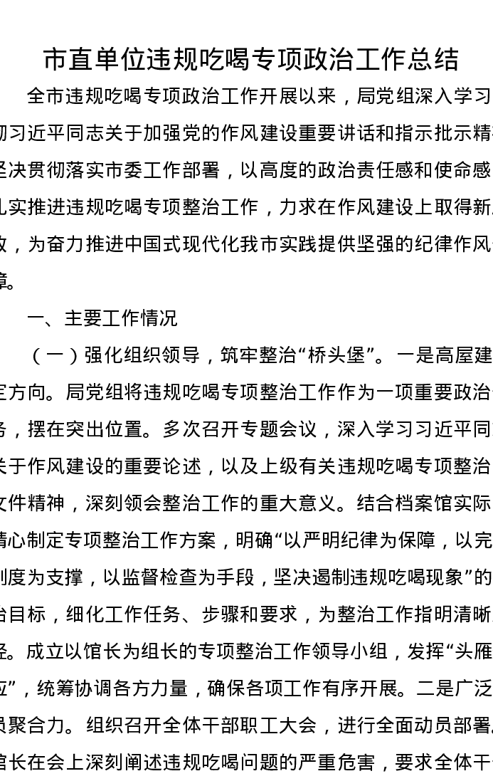市直单位违规吃喝专项政治工作总结