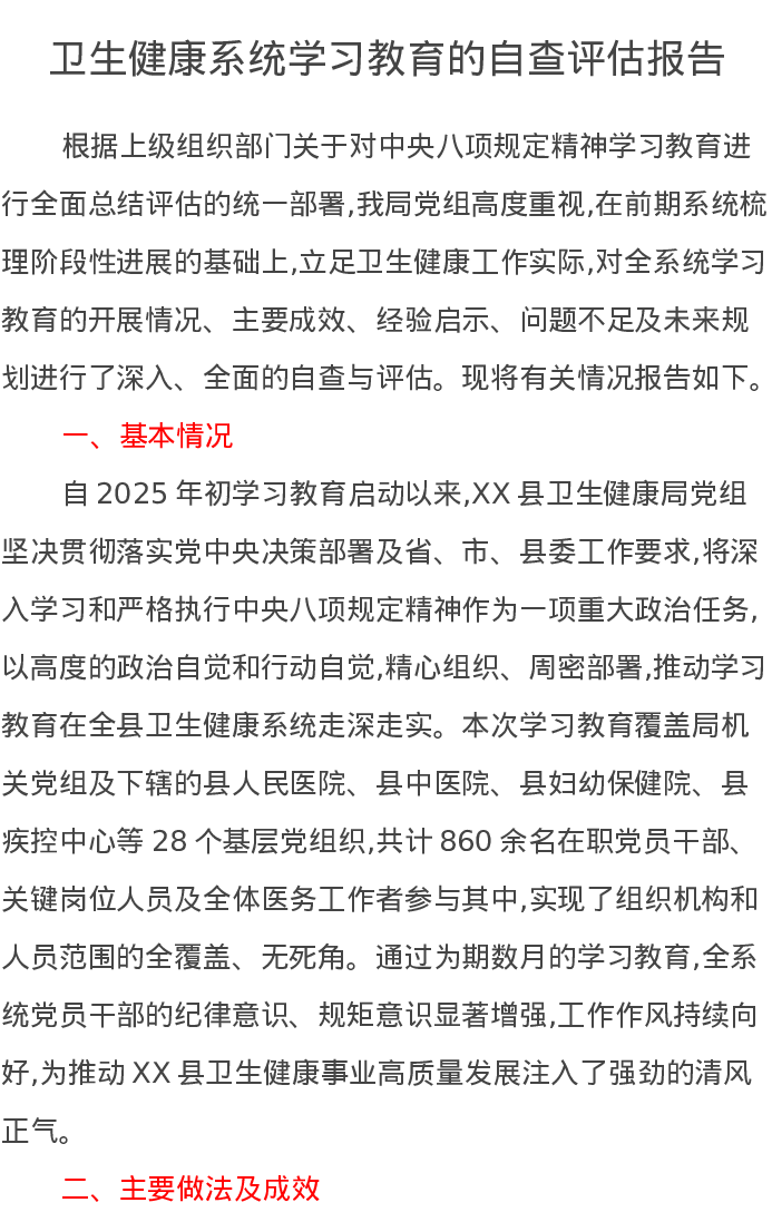卫生健康系统贯彻中央八项规定精神学习教育的自查评估报告
