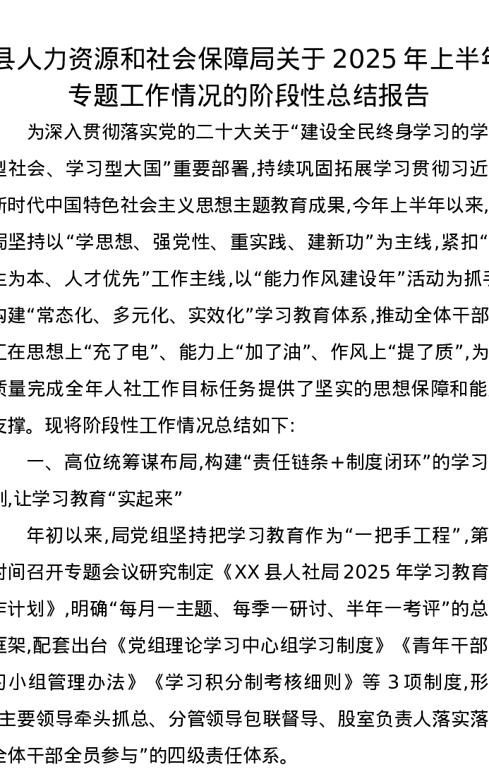县人力资源和社会保障局关于2025年上半年专题工作情况的阶段性总结报告