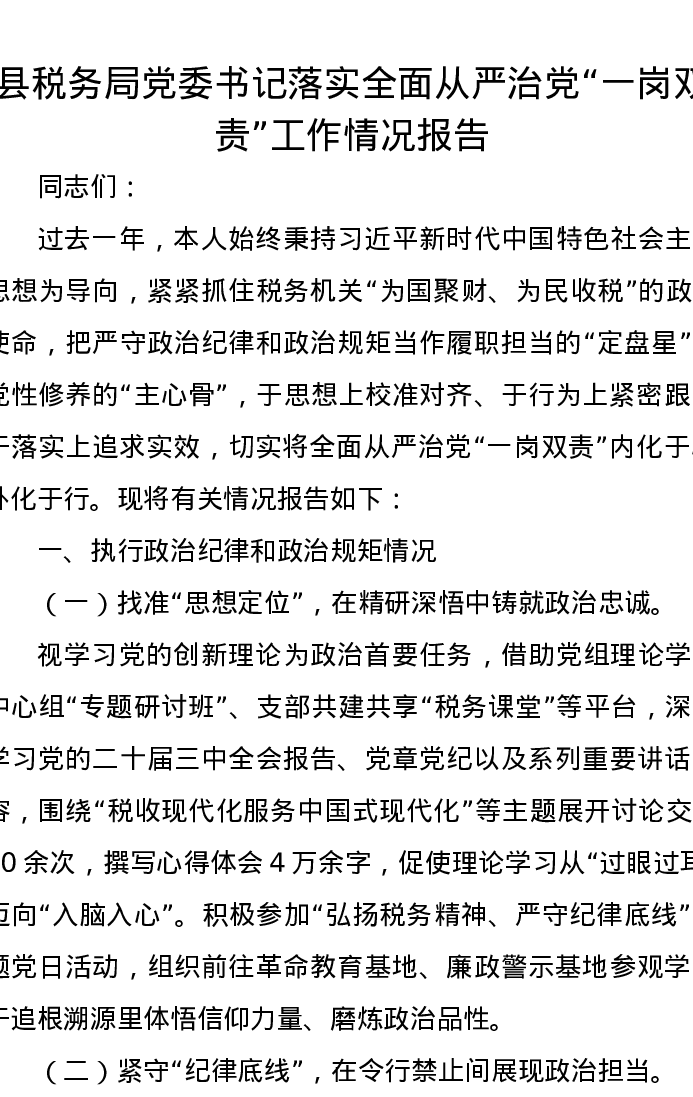 县税务局党委书记落实全面从严治党“一岗双责”工作情况报告