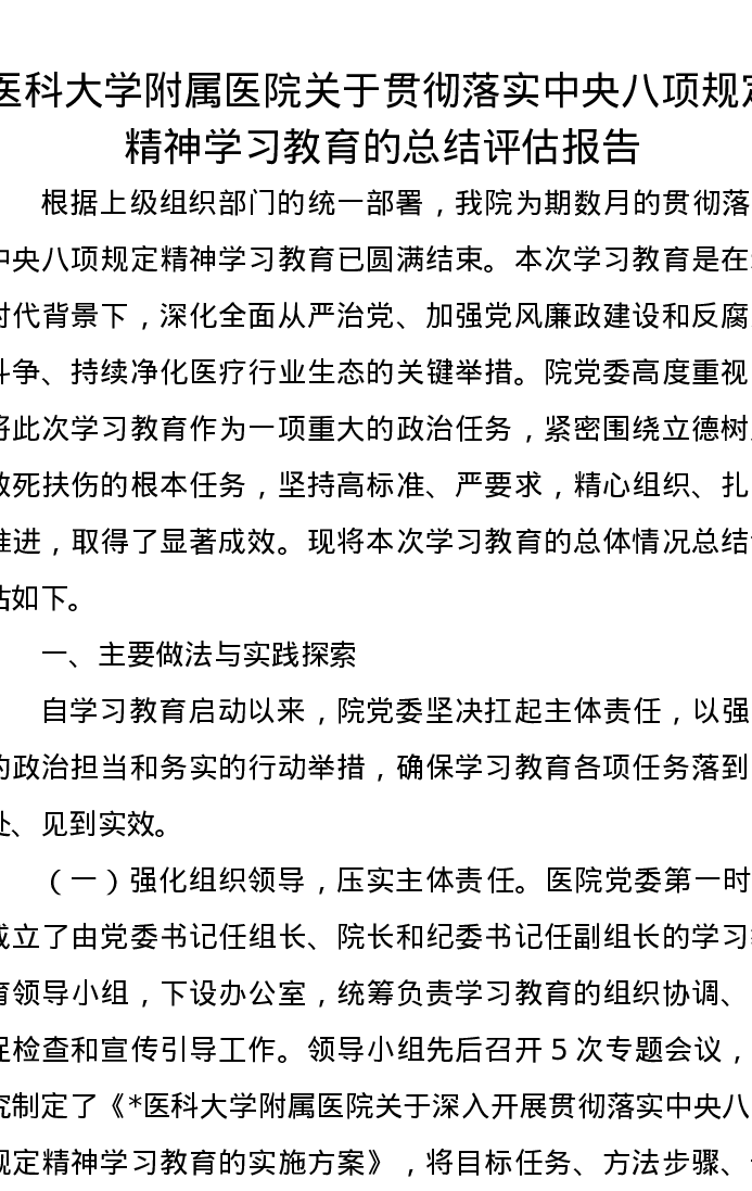 医科大学附属医院关于贯彻落实中央八项规定精神学习教育的总结评估报告