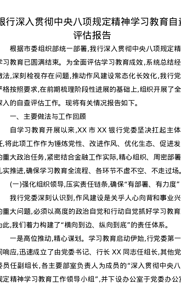 银行深入贯彻中央八项规定精神学习教育自查评估报告